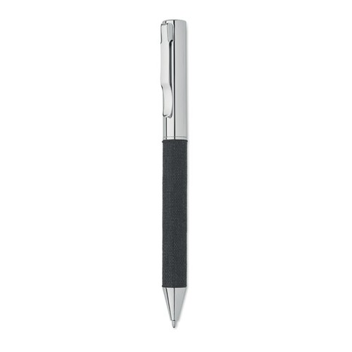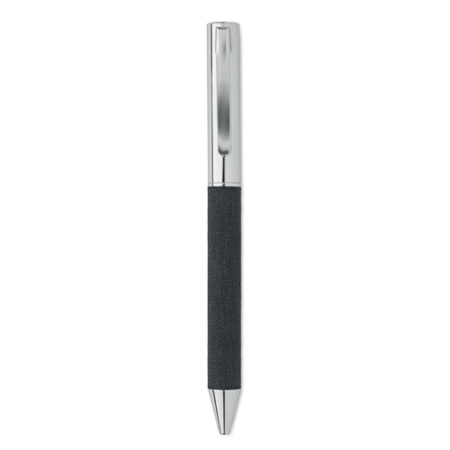 Stylo bille twist en métal avec détails en polyester RPET présenté dans une boîte cadeau. Encre bleue.