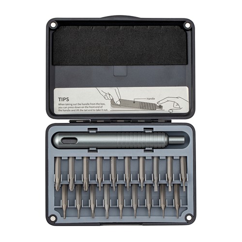 Les tâches précises exigent des outils précis. Ce set d'outils mécaniques de précision haut de gamme, présenté dans un élégant coffret noir, est spécialement conçu pour les tâches complexes sur les ordinateurs portables, les ordinateurs, les lunettes, etc. Le tournevis mat avec porte- embout, ainsi que les 19 embouts magnétiques en acier inoxydable S2 ultra- dur - dont 9 embouts de vissage à étoile, 2 embouts de vissage à tête plate et 8 embouts de vissage Phillips - garantissent une adaptabilité et une précision maximales. La boîte, en plastique ABS recyclé, est non seulement élégante, mais elle abrite également son contenu en toute sécurité grâce à sa fermeture magnétique de haute qualité. L'intérieur, en polypropylène recyclé, protège et organise les outils de manière optimale.