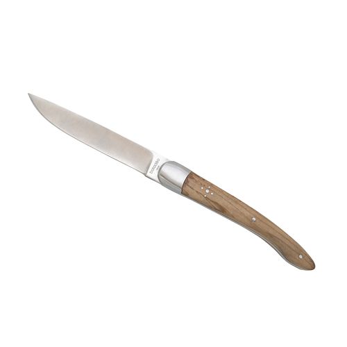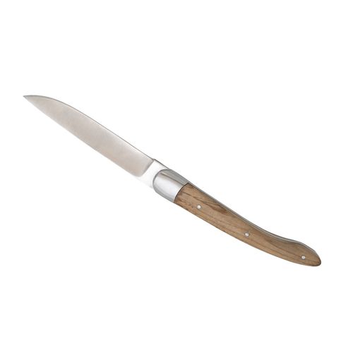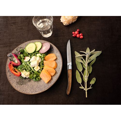 - Manches en bois d'olivier nervuré sur ce grand classique de la coutellerie pour apporter élégance et authenticité sur toutes les tables.