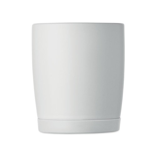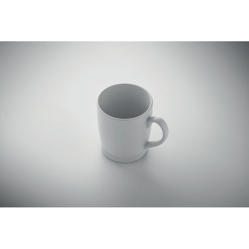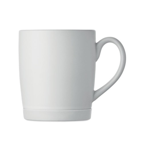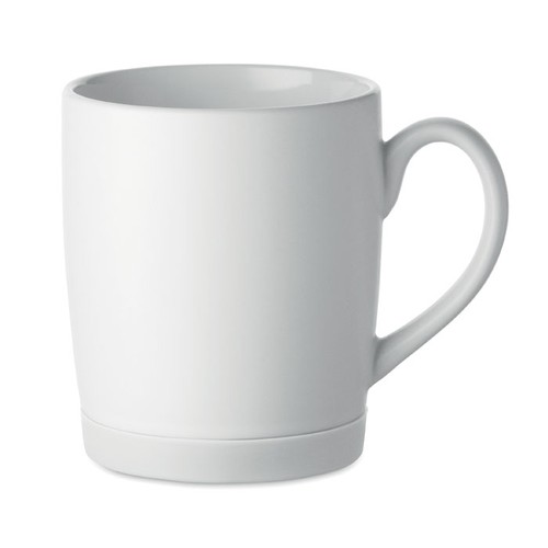 Mug en céramique avec finition blanche mate et base en silicone pour la stabilité. Capacité de 300 ml. Emballage individuel dans une boîte en carton blanc.