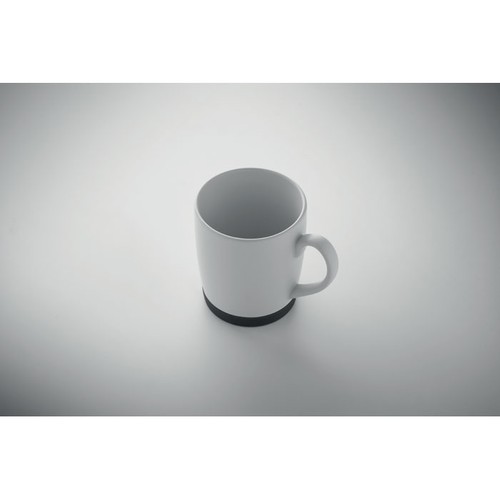 Mug en céramique avec finition blanche mate et base en silicone pour la stabilité. Capacité de 300 ml. Emballage individuel dans une boîte en carton blanc.