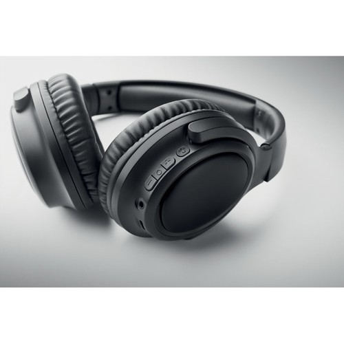 Casque sans fil pliable en ABS à réduction active du bruit (ANC) 5.3. Fonction mains libres et microphone. Autonomie d'env 17 heures. Câble de chargement Type- C inclus. Batterie Li- ION rechargeable de 200 mAh. Portée : 10 m.