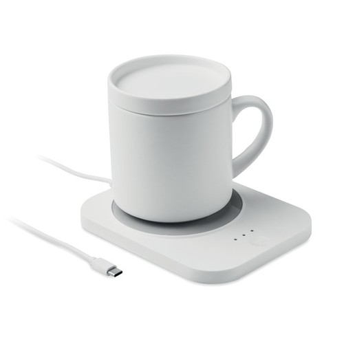 Chargeur sans fil 2 en 1 15W et chauffe- tasse en ABS, mug en céramique inclus. Garde les boissons chaudes jusqu'à un maximum de 50ºC. 3 réglages de température sur panneau tactile. Câble USB. Sortie : DC 9V/1.67A (15W). Capacité 250ml.
