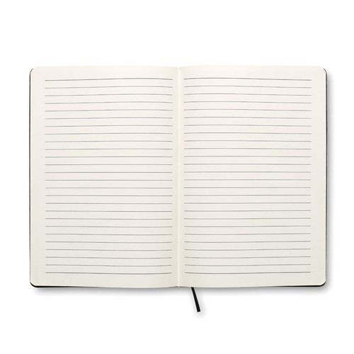 Carnet A5 avec couverture souple en PU. 160 pages lignées (80 feuilles en papier recyclé). Bande élastique de fermeture et marque- page en ruban assortis. Poche intérieure extensible au dos. Porte- stylo sur la tranche.
