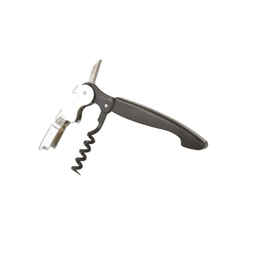 Tire- bouchon professionnel double levier. Manche en acier inoxydable. Mèche 5 spirales avec revêtement anti- adhérent noir. Lame coupe collerette microdentée. Décapsuleur rapide.