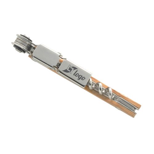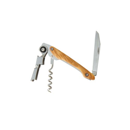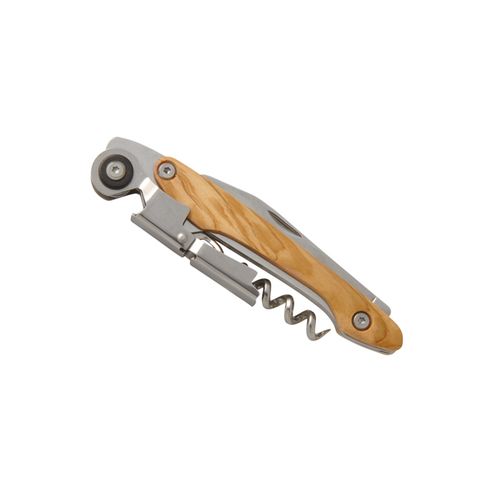 Couteau de poche pliant / tire- bouchon professionnel double levier. Manche en bois d'olivier nervuré. Lame de 8cm. Mèche 5 spirales en acier inoxydable. Assemblage vissé Torx. Décapsuleur rapide. Livré dans un étui gris chiné en RPET.