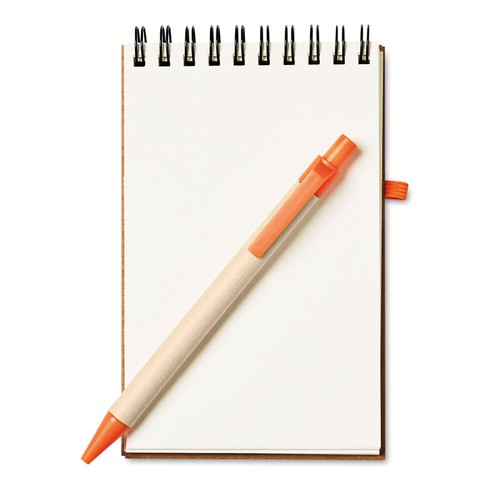 Carnet à spirale en papier recyclé avec stylo assorti. 140 pages en papier recyclé ordinaire (70 feuilles). Stylo à bille à bouton poussoir assorti en carton recyclé et plastique biodégradable. Encre bleue. Bande élastique de fermeture et passant à stylo. FSC®- certified | FSC MIX, P7.1, FSC- C213206