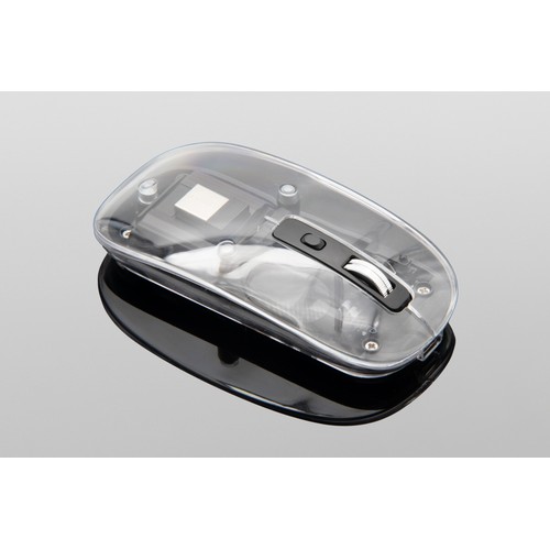 Souris sans fil rechargeable avec logo lumineux et couvercle magnétique transparent amovible.