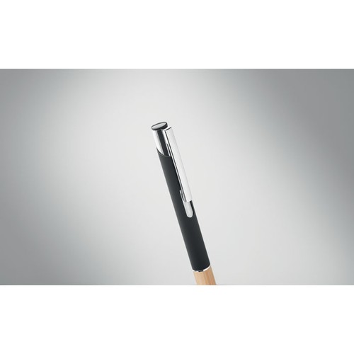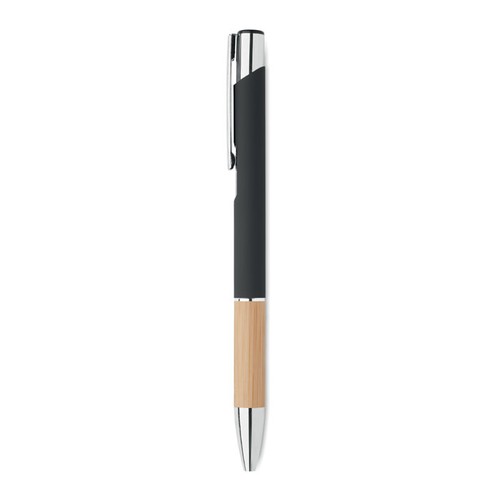 Stylo à bouton poussoir en aluminium avec prise en bambou. Encre bleue.