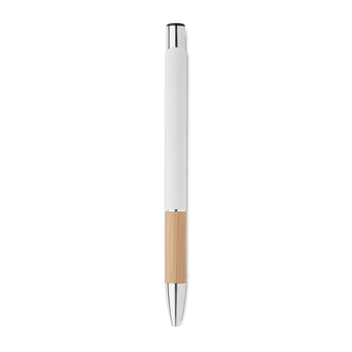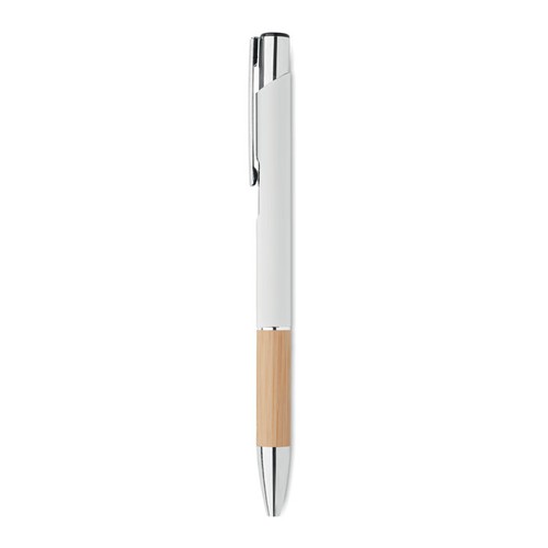 Stylo à bouton poussoir en aluminium avec prise en bambou. Encre bleue.