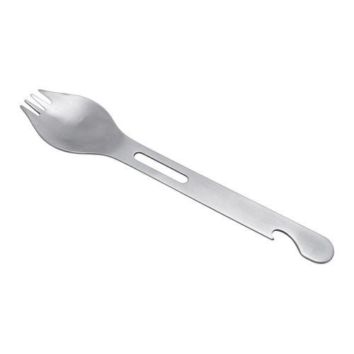 Couverts de voyage 2 en 1 (Cuillère- fourchette) en acier inoxydable 420 alimentaire avec finition satinée. Décapsuleur intégré dans le manche. Passe au lave- vaisselle.