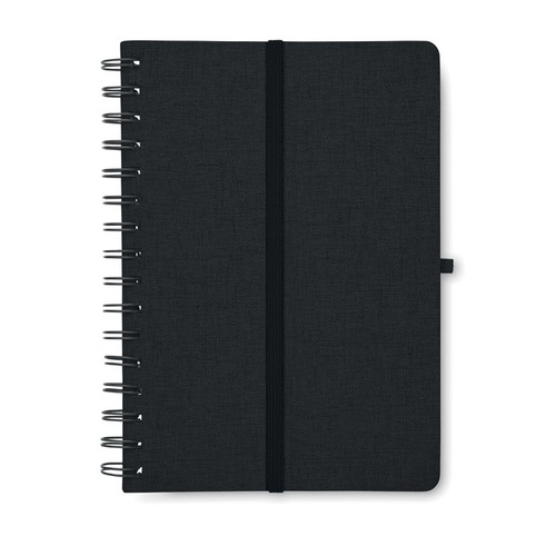 Carnet A5 avec couverture rigide en 600D RPET et fonction de support pour smartphone. Reliure à spirale. 160 pages lignées (80 feuilles). papier recyclé 70 g/m². Fermeture par élastique.