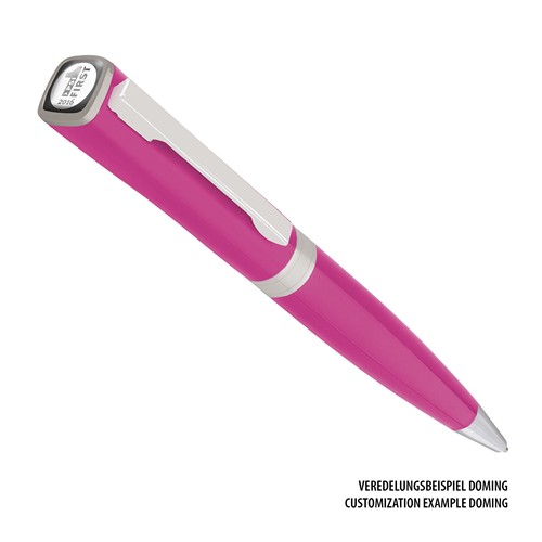 Exclusif chez CLIC CLAC: ce stylo à bille qui porte votre logo a un véritable caractère de stylo de marque, grâce à un effet doming individuel raffiné. Le doming carré est fixé sur la tête du stylo.