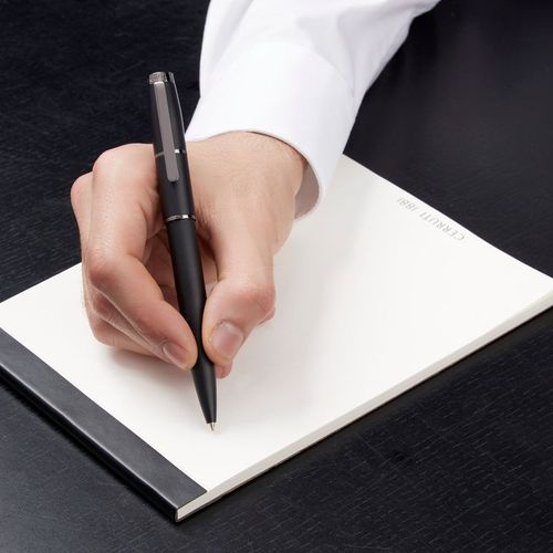 Le stylo Cerruti 1881 "Brick" fait peau neuve cette année dans une édition black & gun. Sa surface gravée au diamant ajoute une touche de luxe supplémentaire, complétée par de magnifiques garnitures de pistolet. Le logo CRR est subtilement imprimé dans un gris foncé ton sur ton. Un objet d'écriture étonnamment moderne et simple, disponible en stylo à bille, roller ou plume.