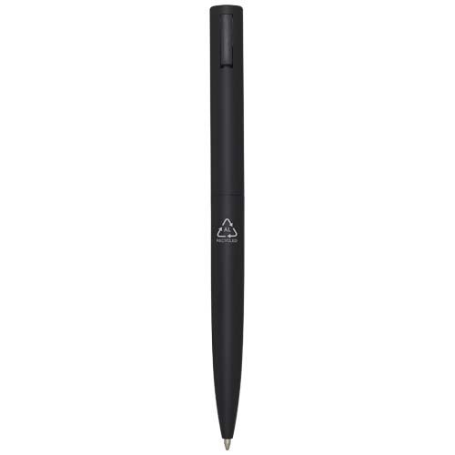 Stylo bille dont le corps supérieur est en plastique recyclé et la partie inférieure en aluminium recyclé. Le stylo est muni d'un clip métallique à ressort qui permet de l'accrocher à des objets plus épais tels que des sacs ou des cahiers. Le clip se referme avec un clic audible. Couleur d’encre : Noire. Longueur d'écriture : 1 000 mètres. Taille de la pointe : 1,0 mm.