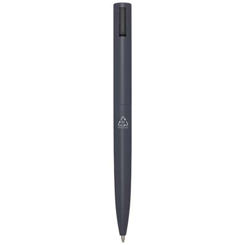 Stylo bille dont le corps supérieur est en plastique recyclé et la partie inférieure en aluminium recyclé. Le stylo est muni d'un clip métallique à ressort qui permet de l'accrocher à des objets plus épais tels que des sacs ou des cahiers. Le clip se referme avec un clic audible. Couleur d’encre : Noire. Longueur d'écriture : 1 000 mètres. Taille de la pointe : 1,0 mm.