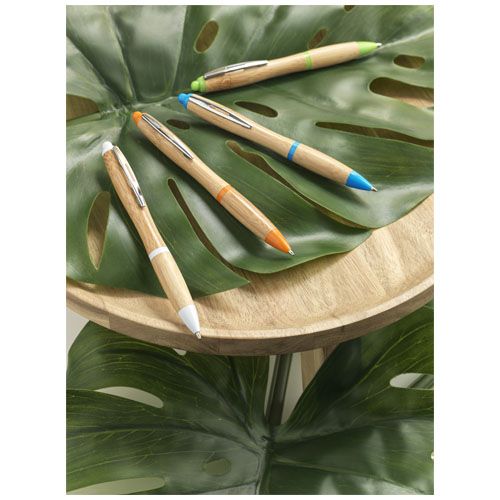 Stylo bille rétractable avec corps en bambou, rehaussé par une agrafe chromée et des finitions en plastique ABS. La couleur du bambou peut varier.