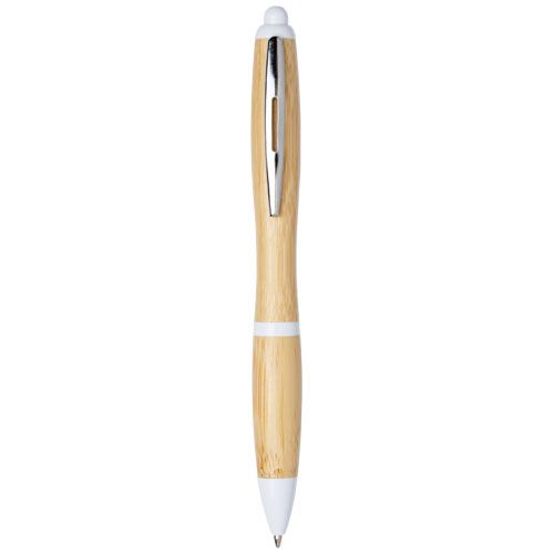 Stylo bille rétractable avec corps en bambou, rehaussé par une agrafe chromée et des finitions en plastique ABS. La couleur du bambou peut varier.