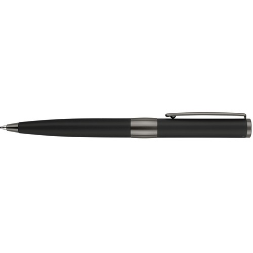 Stylo à bille avec corps en métal recouvert d'une laque souple noire mate. Attributs en métal mat. Recharge métal super grande capacité, écriture bleue.