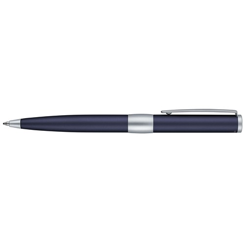 Stylo à bille avec corps en métal recouvert d'une laque souple mate bleu ou grise. Attributs en métal mat. Recharge métal super grande capacité, écriture bleue.