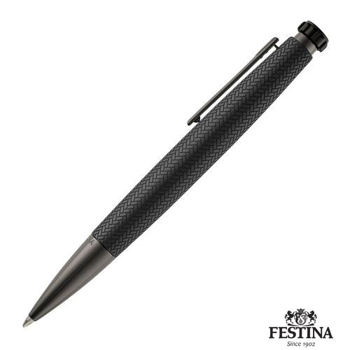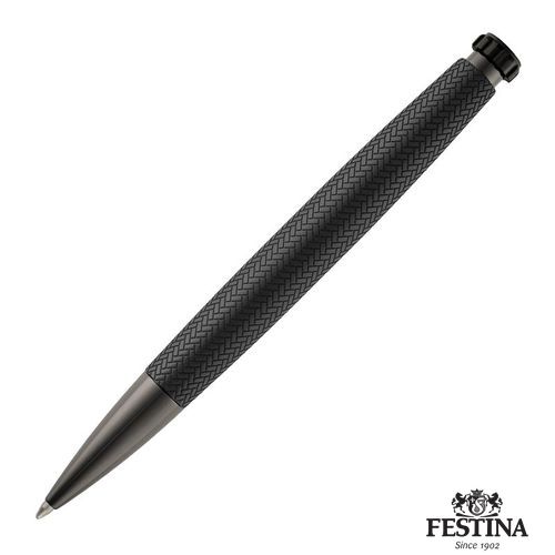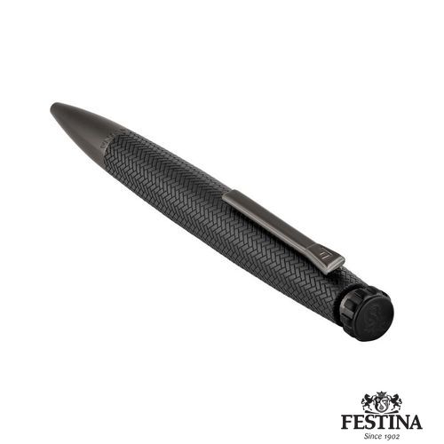 The Interlace ballpoint pen in black and gunmetal is built on the best- selling Chronobike shape and elevated with a woven- inspired surface texture drawn from the eponymous line, bringing depth and sophistication to its tapered, aerodynamic silhouette. This new edition introduces a refined luxe dimension, while the blazon logo engraved on the signature top feature—reminiscent of a watch button—serves as a distinctive Festina hallmark. Presented in a beautiful, understated black palette with gunmetal trims, it offers a modern, active feel with a polished finish.