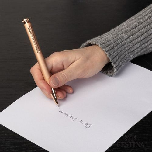 L'instrument d'écriture " Mademoiselle " a été conçu avec une certaine idée de la féminité élégante et moderne à l'esprit, tout en restant dans l'ADN du design des instruments d'écriture de Festina. La silhouette du stylo est élégante et équilibrée, avec une surface jouant sur le contraste entre les garnitures luxueuses en or clair et l'aluminium brossé moderne. Il est disponible dans une gamme de couleurs vibrantes. La touche finale est apportée par les pierres de cristal qui ornent le dessus, apportant une sensation de luxe à ce magnifique instrument d'écriture.