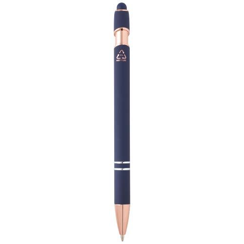 Le stylo bille Nanna avec finition or rose est pourvu d’un corps en aluminium recyclé et d’un stylet tactile en silicone. L’aluminium recyclé réduit également la quantité de déchets dans les décharges et contribue ainsi à la conservation des ressources naturelles, tout en réduisant les émissions de gaz à effet de serre. Couleur de l'encre : Bleue. Longueur d'écriture : 800 mètres. Taille de la plume : 1,0 mm.