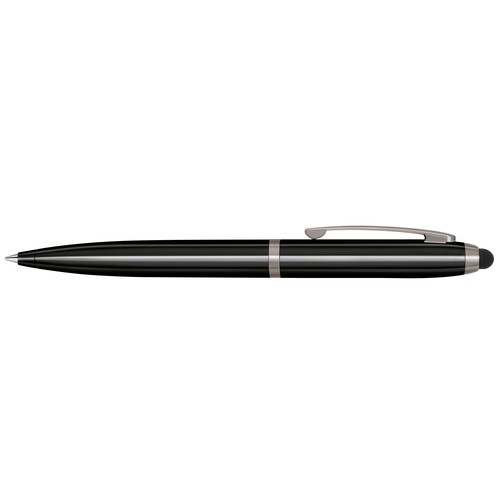 Stylo à bille avec corps en métal laqué métal gun et laque souple métal gun. Attributs en métal chromé brillants. Capuchon compatible écran. Recharge métal super grande capacité, type G2, écriture bleue.