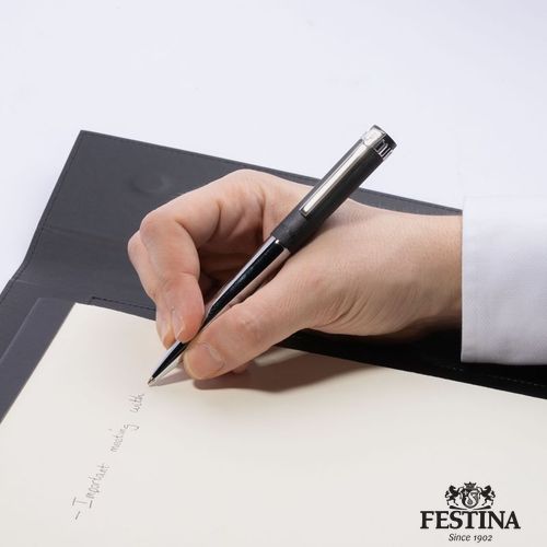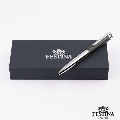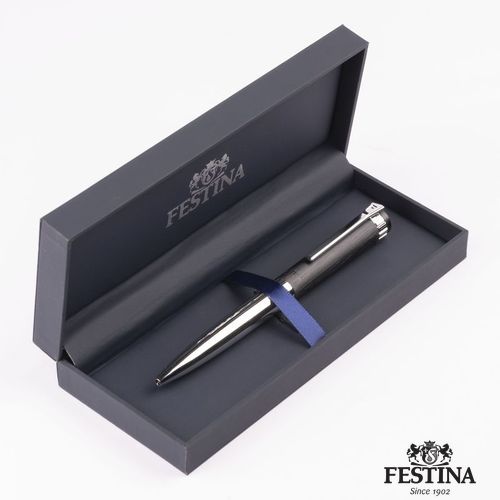 Paré de textures et d'ornements typiques inspirés des montres Festina, le stylo bille Prestige se présente sous des traits nobles, avec un contour et des tons délicats : association d'un capuchon noir brossé avec un corps et des garnitures chromées brillantes.