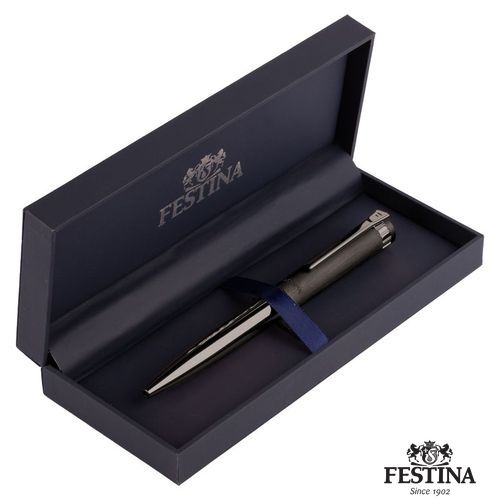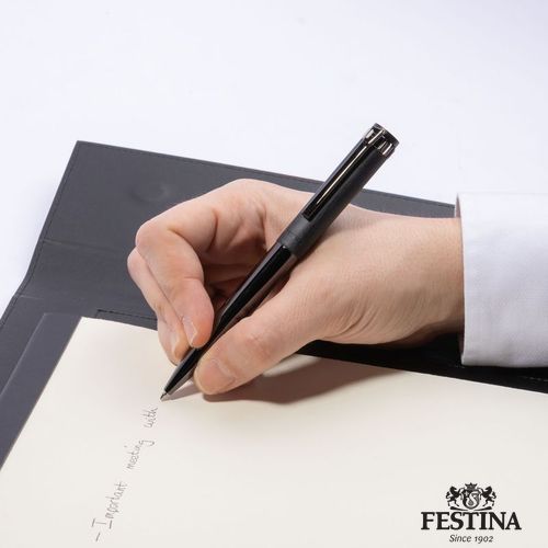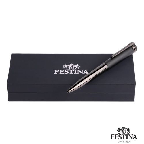 Paré de textures et d'ornements typiques inspirés des montres Festina, le stylo bille Prestige se présente sous des traits nobles, avec un contour et des tons délicats : association d'un corps noir mat, d'un capuchon noir brossé et de finitions noires laquées.
