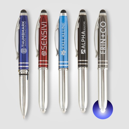 Notre stylo best- seller dans la catégorie des stylos multifonctions. Ce stylo bille est équipé d'une pointe en silicone au sommet du capuchon. Finition anodisée disponible en plusieurs couleurs. Couleur d'écriture noire ou bleue. Possibilité de gravure 360° pour des logos détaillés et un maximum d'impact.