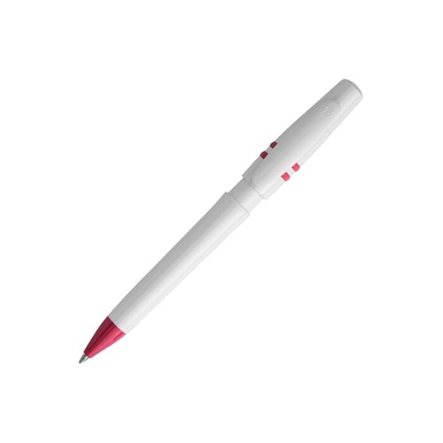 Stylo bille Nora de couleur opaque avec corps et clip blancs. Les anneaux du poussoir sont colorés. Cartouche Jumbo pouvant écrire jusqu’à 4.5 km. Le stylo est fabriqué en Europe en plastique ABS. À partir de 5.000 pièces, vous pouvez choisir vos propres couleurs.