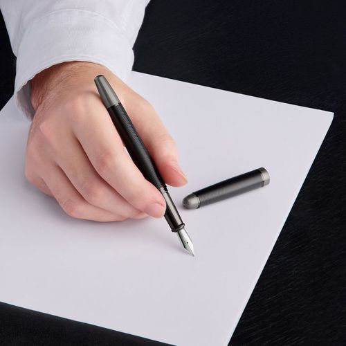 Ce stylo plume classique, orné d'une gravure en chevron inspirée de la ligne de sacs éponyme, rayonne d'une sophistication intemporelle. Les garnitures en bronze et le contraste entre le mat et le brillant de l'anneau central rehaussent son design raffiné, offrant une expérience d'écriture de haut niveau à un prix abordable.