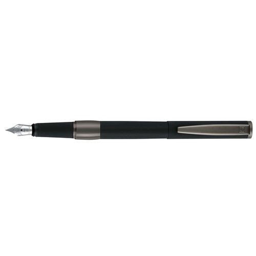 Stylo plume avec corps en métal recouvert d'une laque souple noire mate. Attributs en métal mat. Plume en acier inoxydable à pointe iridium (M).