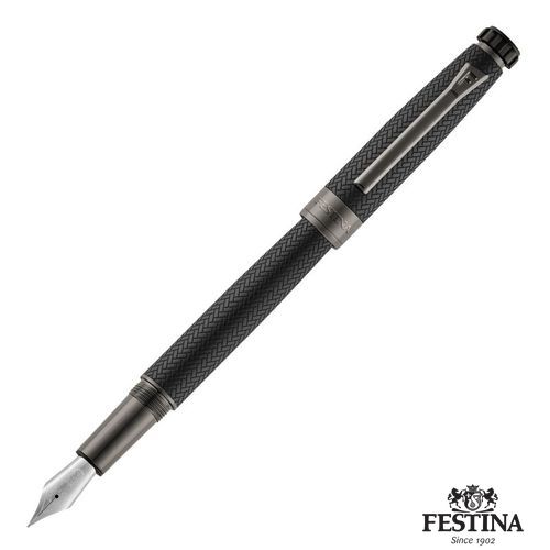 The Interlace fountain pen in black and gunmetal blends the best- selling Chronobike silhouette with a woven- inspired texture that adds depth and a distinctly modern sophistication. The tapered, aerodynamic shape introduces an active edge, while gunmetal trims and a finely executed nib enhance its luxurious presence. The engraved blazon atop the signature watch- inspired button anchors the design in Festina heritage. Understated in black and elevated with its textured finish, this fountain pen embodies a harmonious balance of refinement and performance.