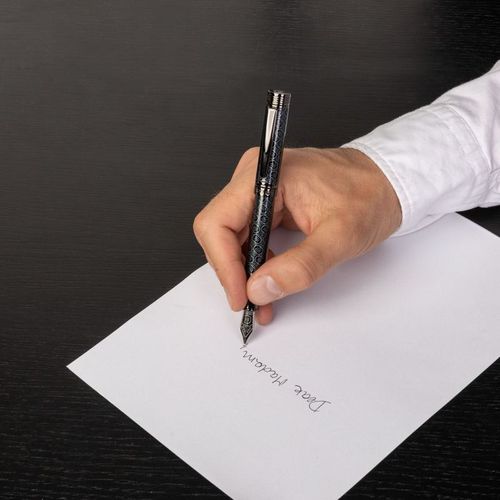 Cette année, Cerruti suit la tendance des monogrammes, mais bien sûr avec une touche de modernité. Le résultat ? Cette nouvelle version de notre stylo iconique "Zoom", réinventé avec un imprimé monogramme sur toute la surface, orné du nouveau logo Cerruti. Le secret pour rester élégant a été de garder cette pièce audacieuse dans des tons discrets, en mélangeant le noir, le gun et le gris foncé. Le résultat est un bel instrument d'écriture, élégamment marqué.
