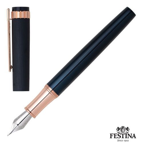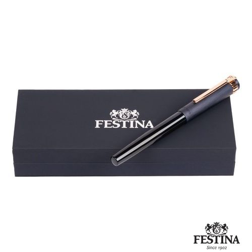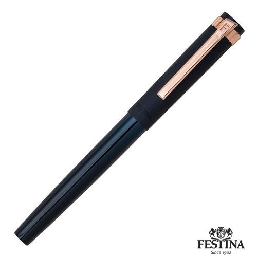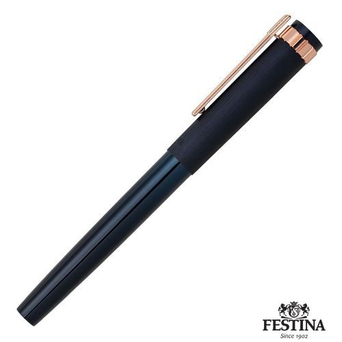 Paré de textures et d'ornements typiques inspirés des montres Festina, le stylo roller Prestige se présente sous des traits nobles, avec un contour et des tons délicats : association d'un capuchon bleu nuit brossé avec un corps et des garnitures en or rose.