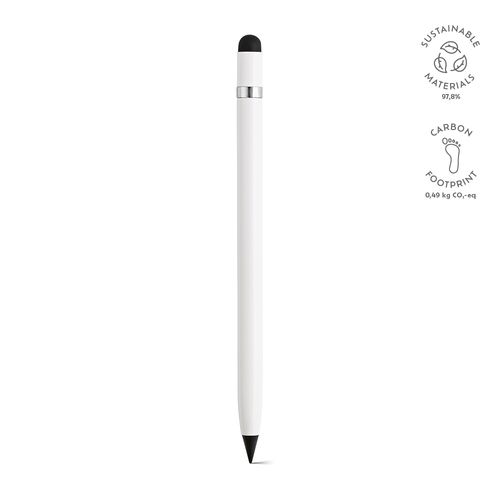 Stylo sans encre Voltaire, corps en aluminium recyclé avec pointe en graphite. Détail argenté anti- roulement, gomme intégrée et pointe tactile. Livré dans une boîte noire individuelle en papier recyclé.