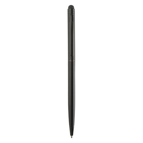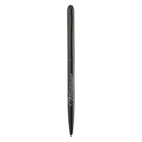 Stylo à bille multifonction à profil fin avec embout de stylet pour écrans tactiles. Corps de couleur mate avec attribut chromé brillant de couleur assortie.