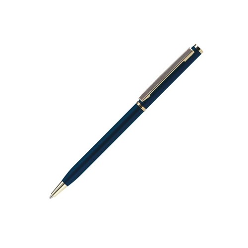 Stylo bille en métal avec corps très fin et attributs couleur doré. Cartouche métal d' encre bleue. Gravure laser possible.