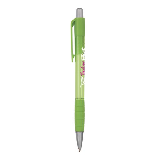 Stylo à bille rétractable populaire avec corps de couleur translucide, attribut de couleur solide et touches chromées.