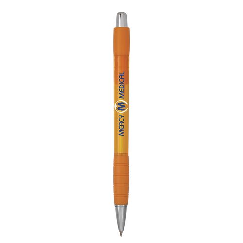 Stylo à bille rétractable populaire avec corps de couleur translucide, attribut de couleur solide et touches chromées.