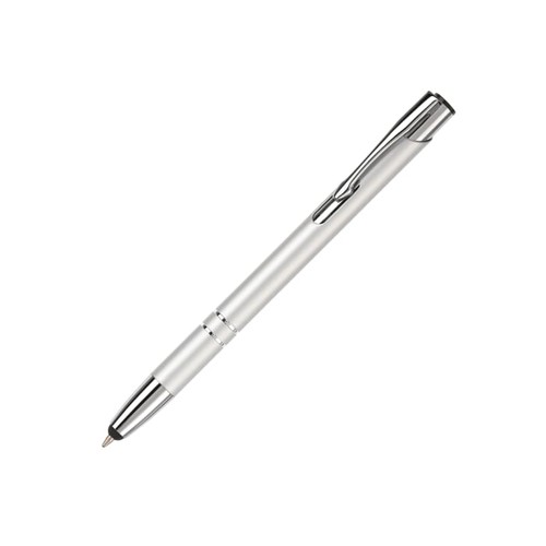 Stylo aluminium élégant avec deux anneaux et incluant la fonction stylet. Ecriture bleue.