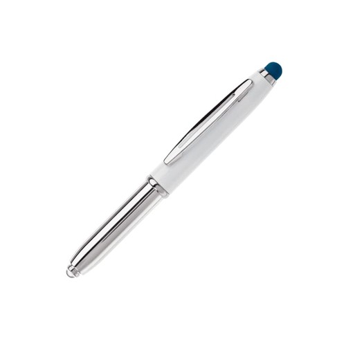 Stylo bille/stylet avec lampe. Fonction stylo bille en enlevant le capuchon. Ecriture bleue.