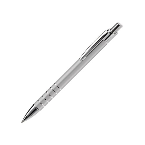 Stylo bille en aluminium avec 5 anneaux finition argent. Personnalisation Laser individuelle possible à partir de 50 pces. Cartouche en métal d'encre noire.