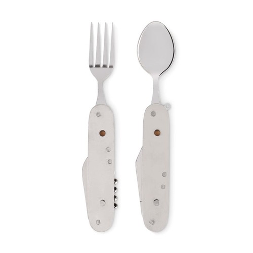 Outil multifonction de camping pliable en métal avec revêtement dans un boîtier en bois. Comprend une fourchette, une cuillère, un ouvre- boîte, un tire- bouchon et un couteau.