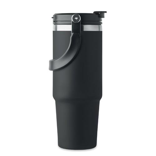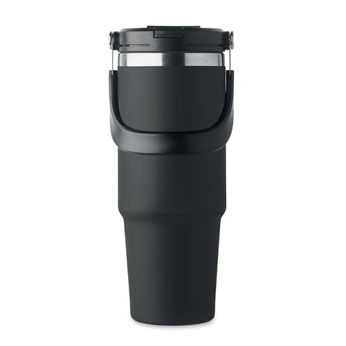 Gobelet à double paroi en acier inoxydable recyclé (90 % d'acier inoxydable recyclé et 10 % d'acier inoxydable) avec couvercle muni d'une paille intérieure, d'un embout pliable et d'une ouverture pour boire directement. Capacité de 850 ml.