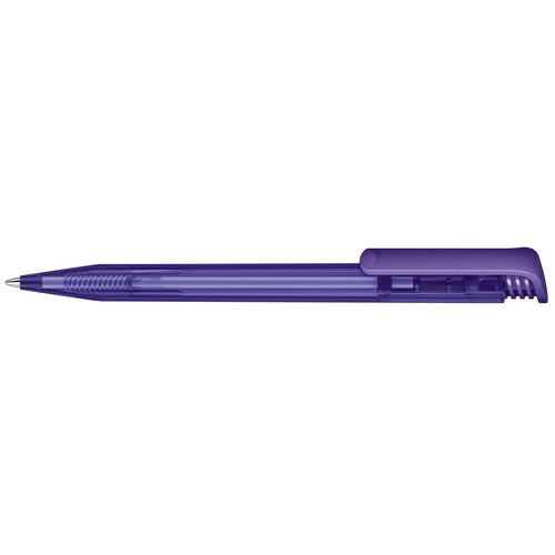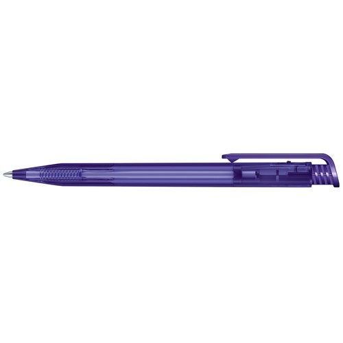 Stylo à bille rétractable avec corps en plastique transparent et clip en plastique brillant.