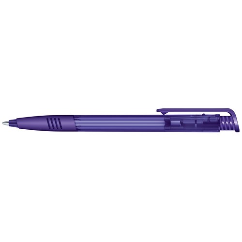 Stylo à bille rétractable avec corps en plastique transparent et clip en plastique brillant et grip souple.