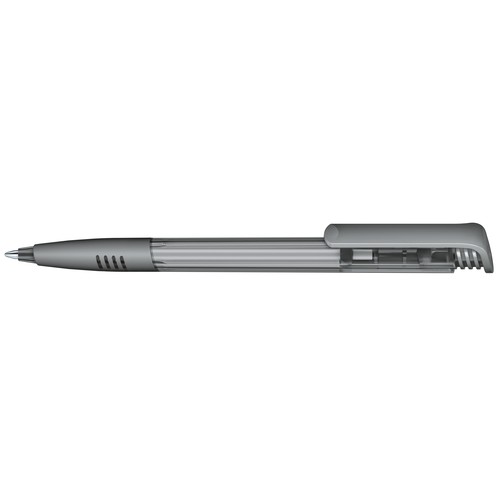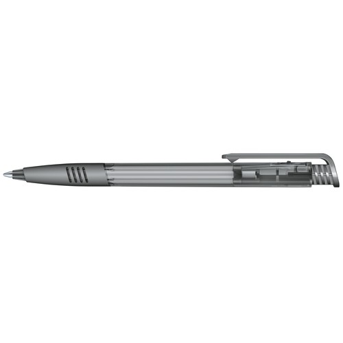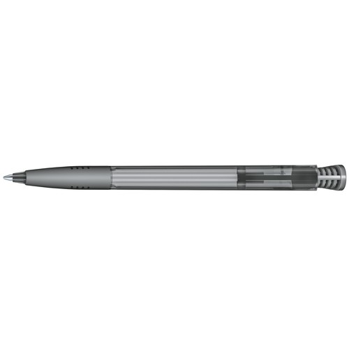 Stylo à bille rétractable avec corps en plastique transparent et clip en plastique brillant et grip souple.
